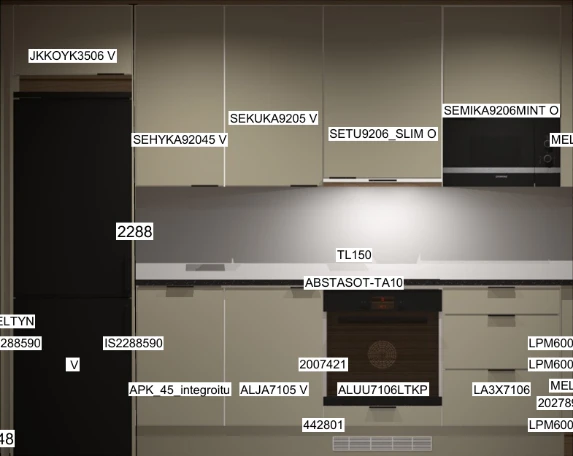 Keittiön komposiittiallas ja astianpesukoneliitännällä varustettu hana ovat mustat. Tasot taas ovat haluamasi sävyistä kestävää ja helppohoitoista 30 mm laminaattia. Samat väri- ja pintakuviovaihtoehdot ovat tarjolla myös välitilaan, minkä lisäksi valittavana on myös alumiinikomposiittivaihtoehtoja.