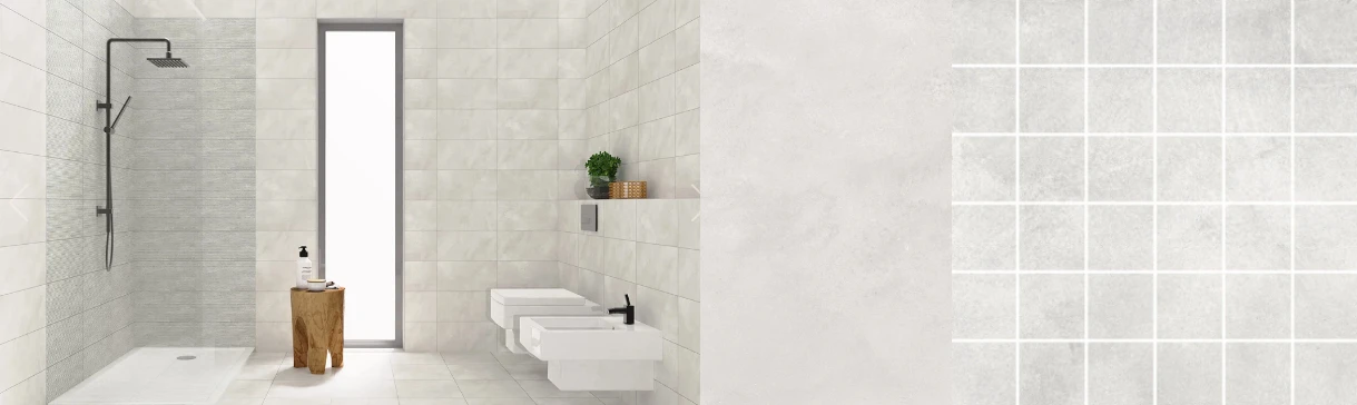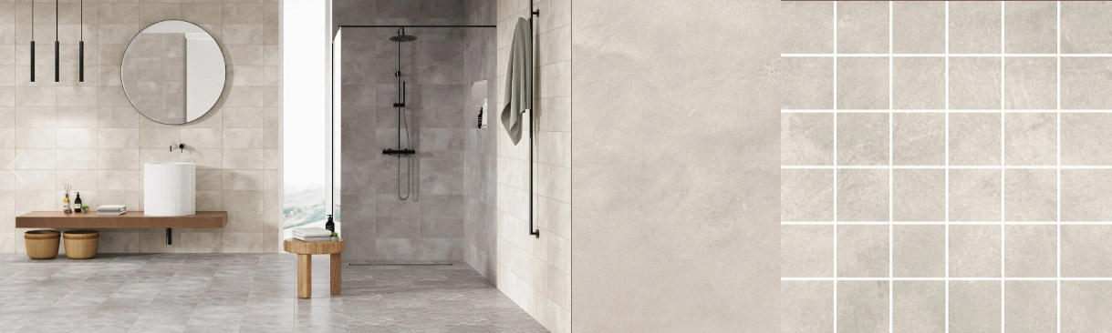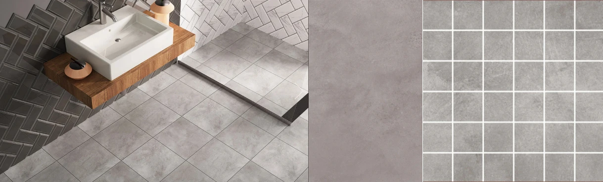 Märkätiloihin valitut laatat ovat Buxielin mallistosta. Niistä on valittavana kolme eri sävyä: Silver (vaalea harmaa), Mud (tummempi harmaa sekä Sand (hiekka).
