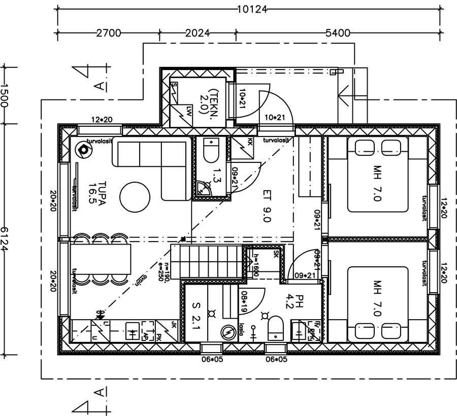 Suksille, polkupyörälle tai muille varusteille on lämmitetty 2 m2 varastotila, ja pihassa on tilaa kahdelle autolle latausvalmiudella.